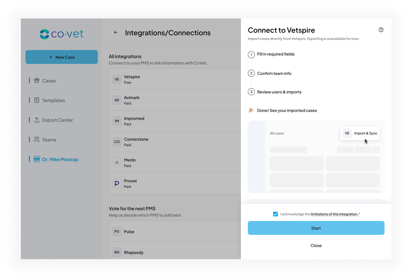 The next screen will clarify the steps needed to set up a connection with CoVet. Please review these steps and the links to any limitations with this Practice Management Software: