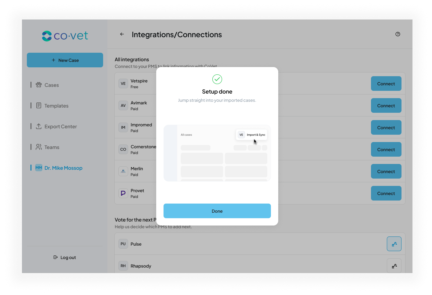 In the next two screens, confirm if you are setting up for your team (recommended) and match up the members of your Team on CoVet with how they appear in Vetspire.