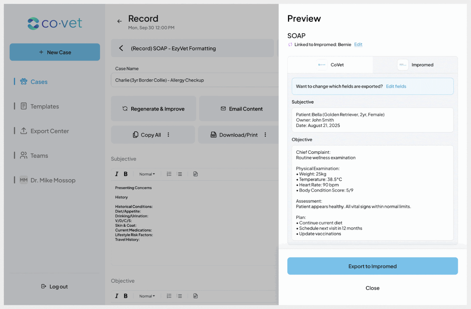 - Preview how CoVet notes will export into your PMS (and adjust export fields as needed)