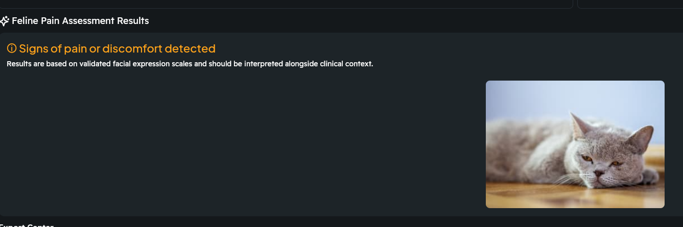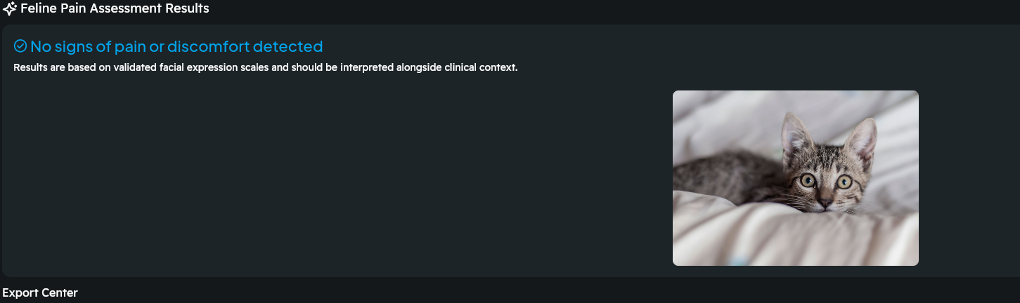 If the photo is successfully reviewed by Sylverster AI, you will see one of two options: Signs of pain or discomfort detected or No signs of pain or discomfort detected: