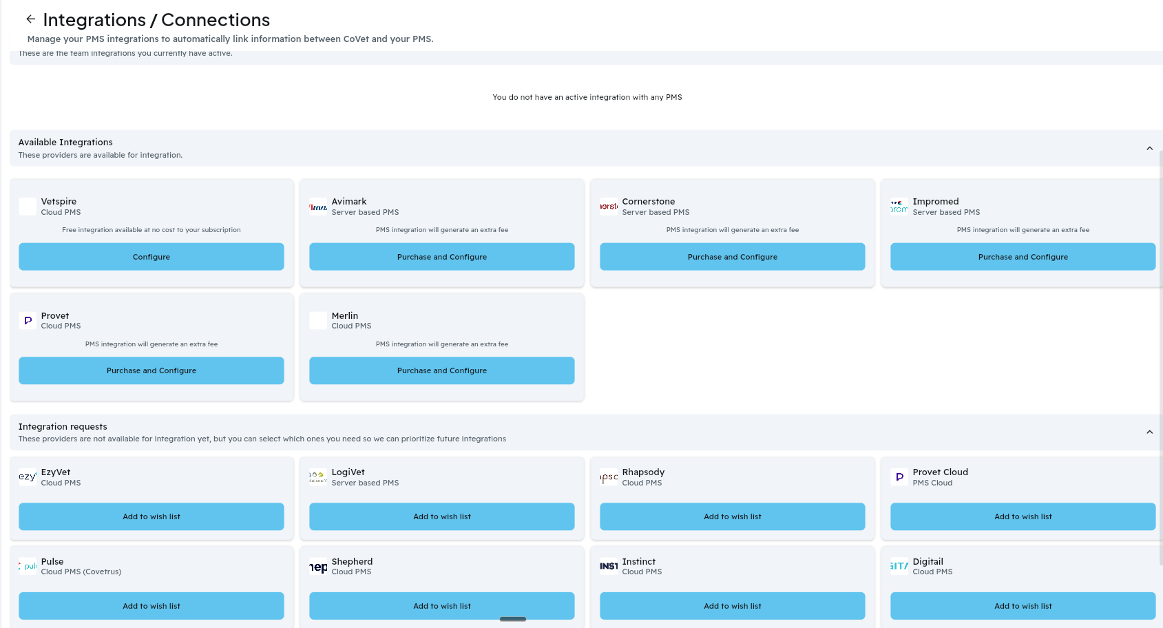 This integration fee will appear on your usual CoVet invoice and will renew according to your regular billing cycle (monthly or annual) until the integration is deleted.