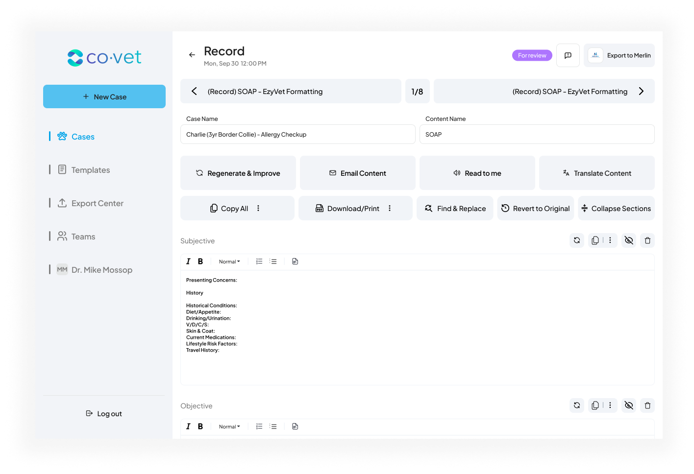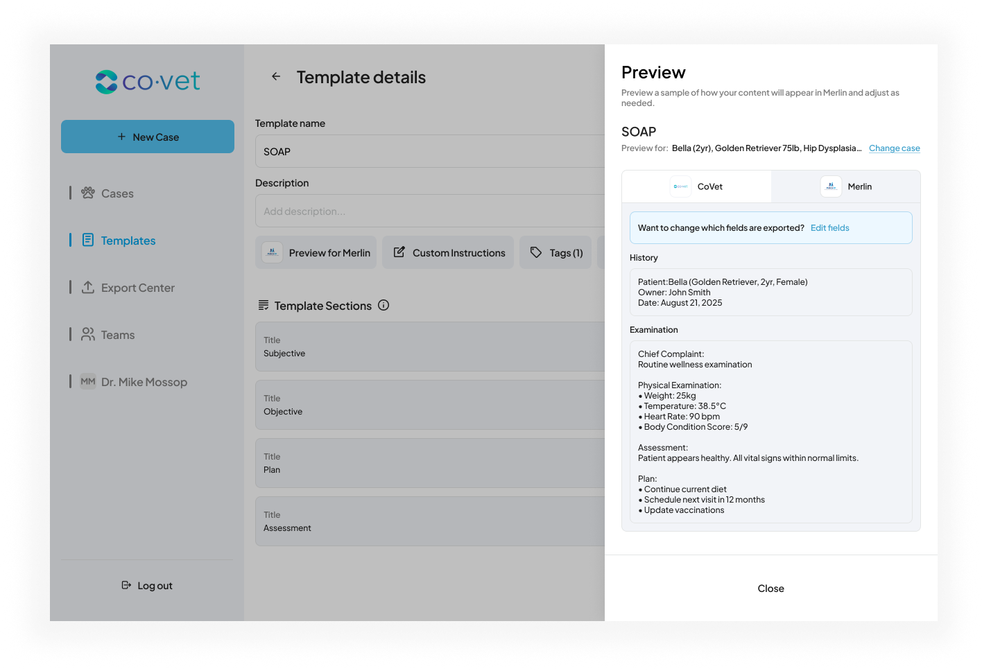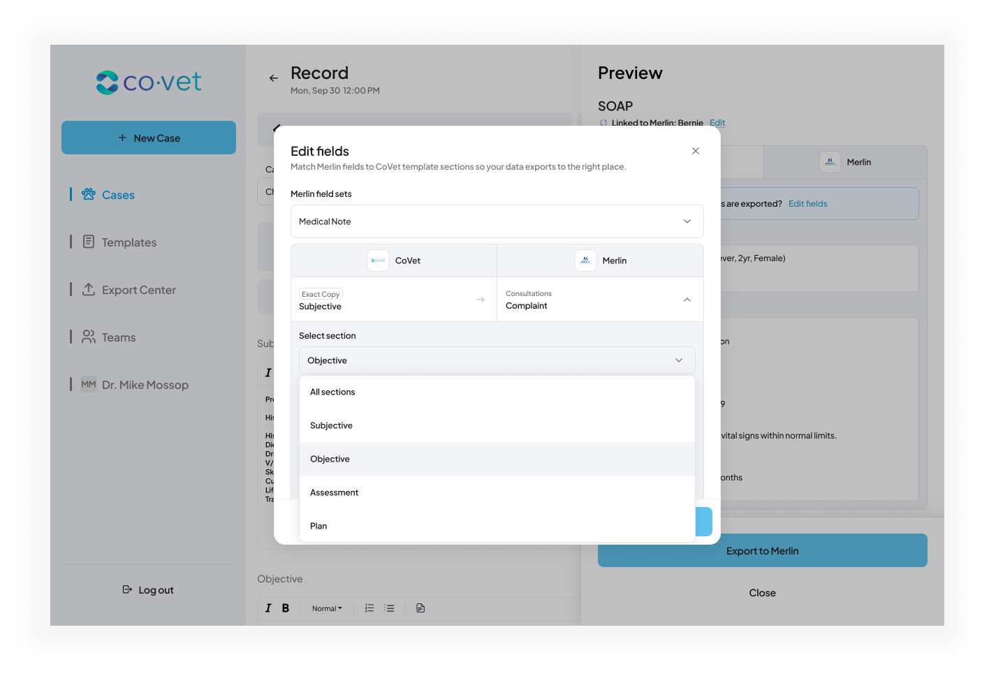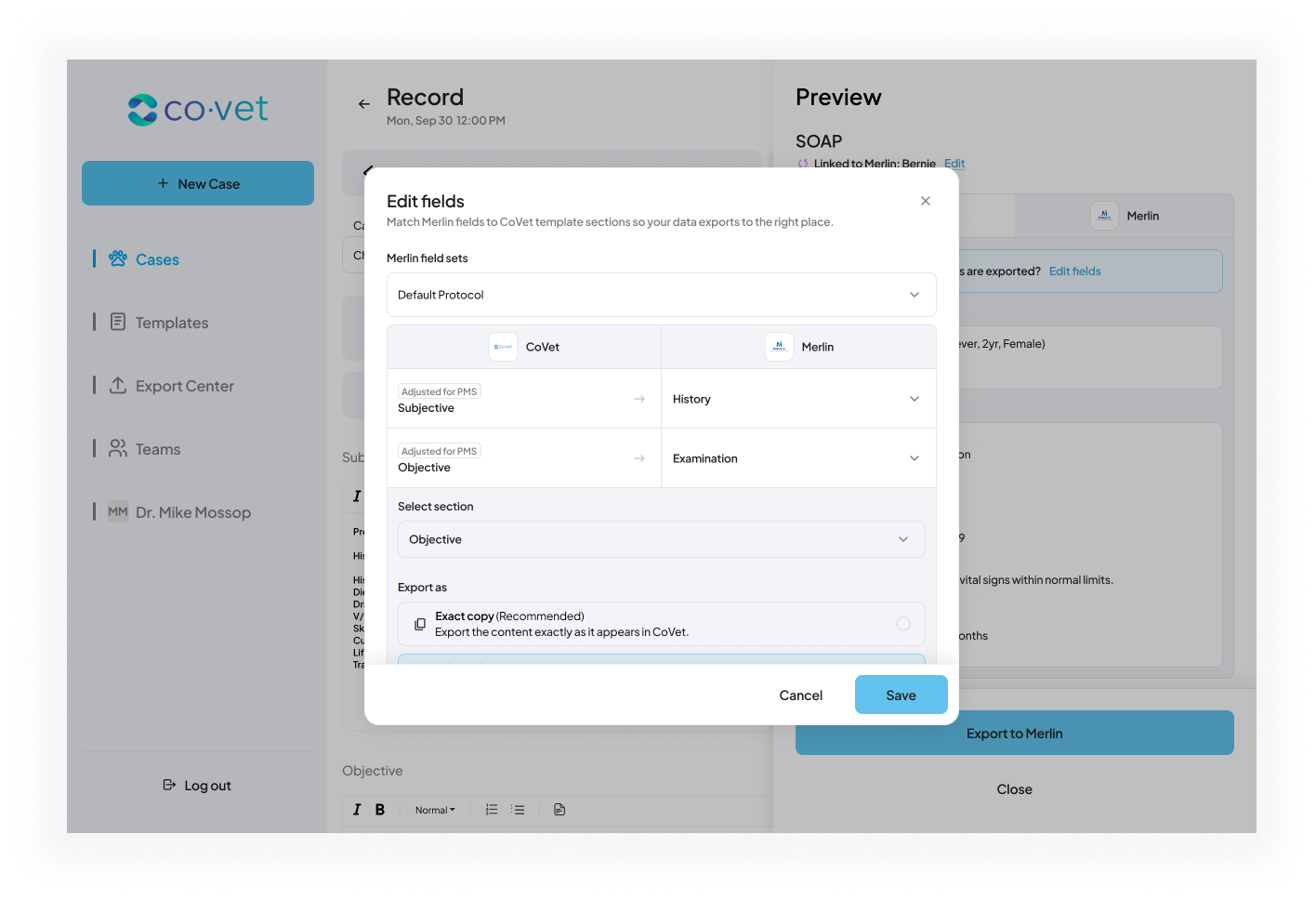 Mapping templates with the Merlin integration ensures that when you use the Export to PMS button in CoVet, all your notes and details are automatically transferred in the correct way.