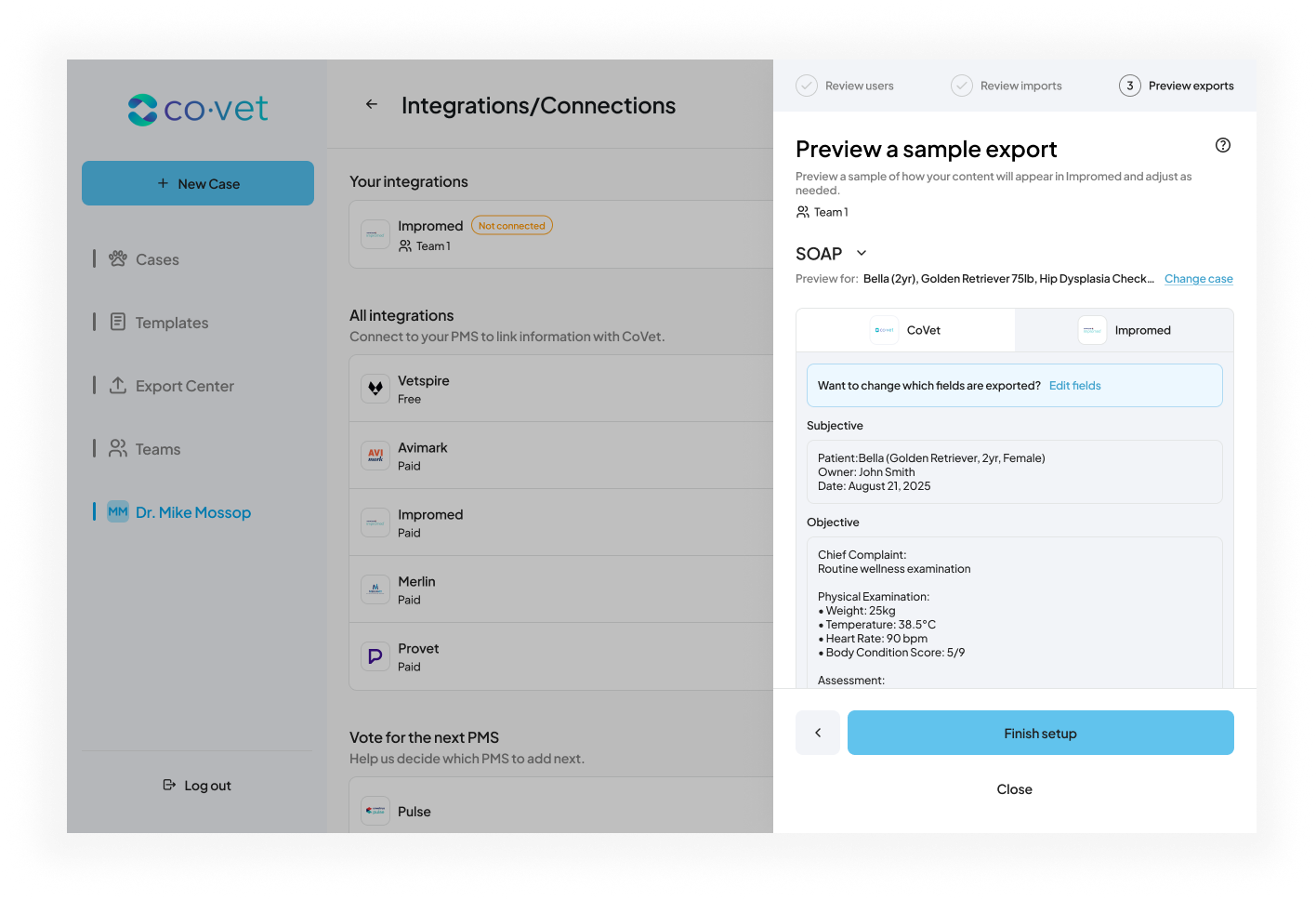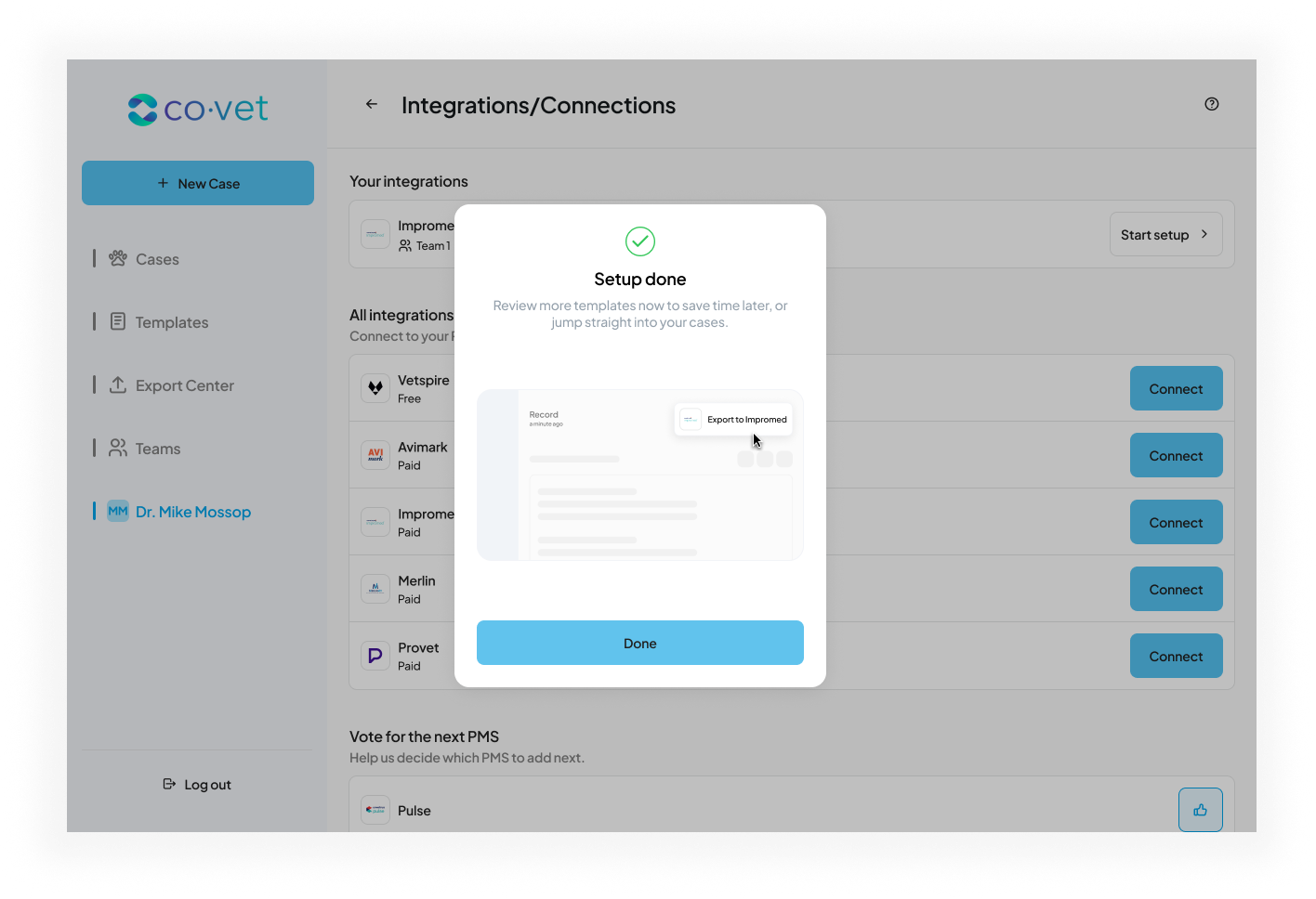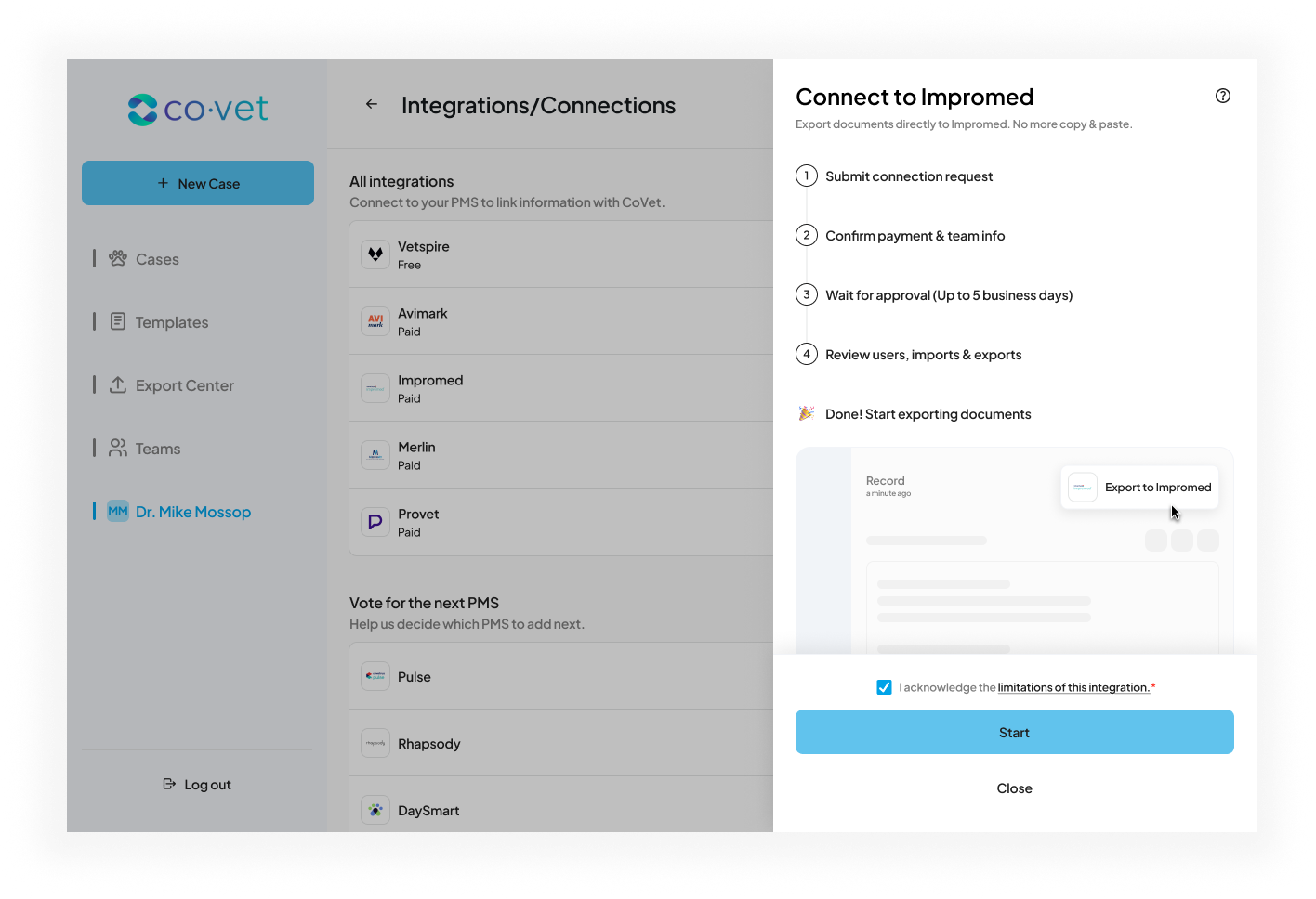 Setting up the Impromed connection allows CoVet to automatically sync appointments and medical records between your practice management system and your CoVet workspace.