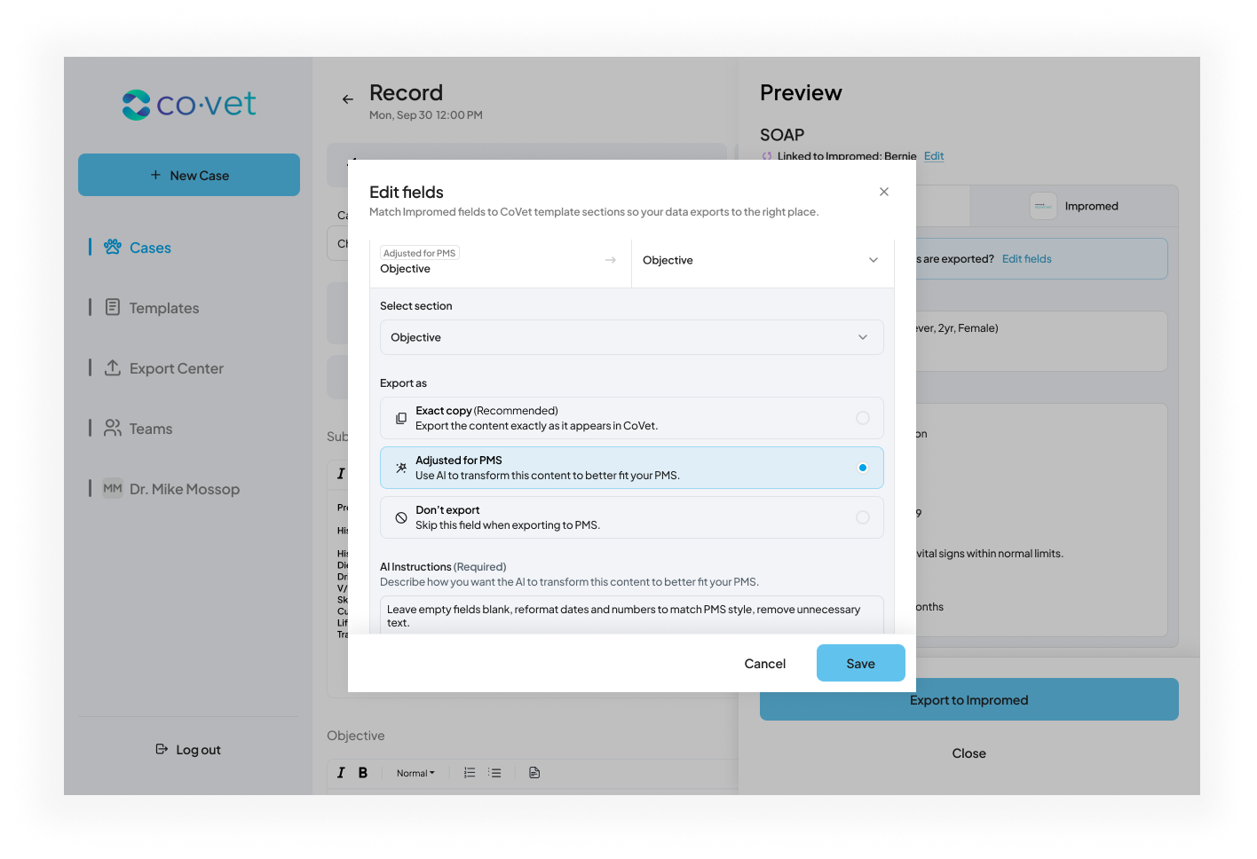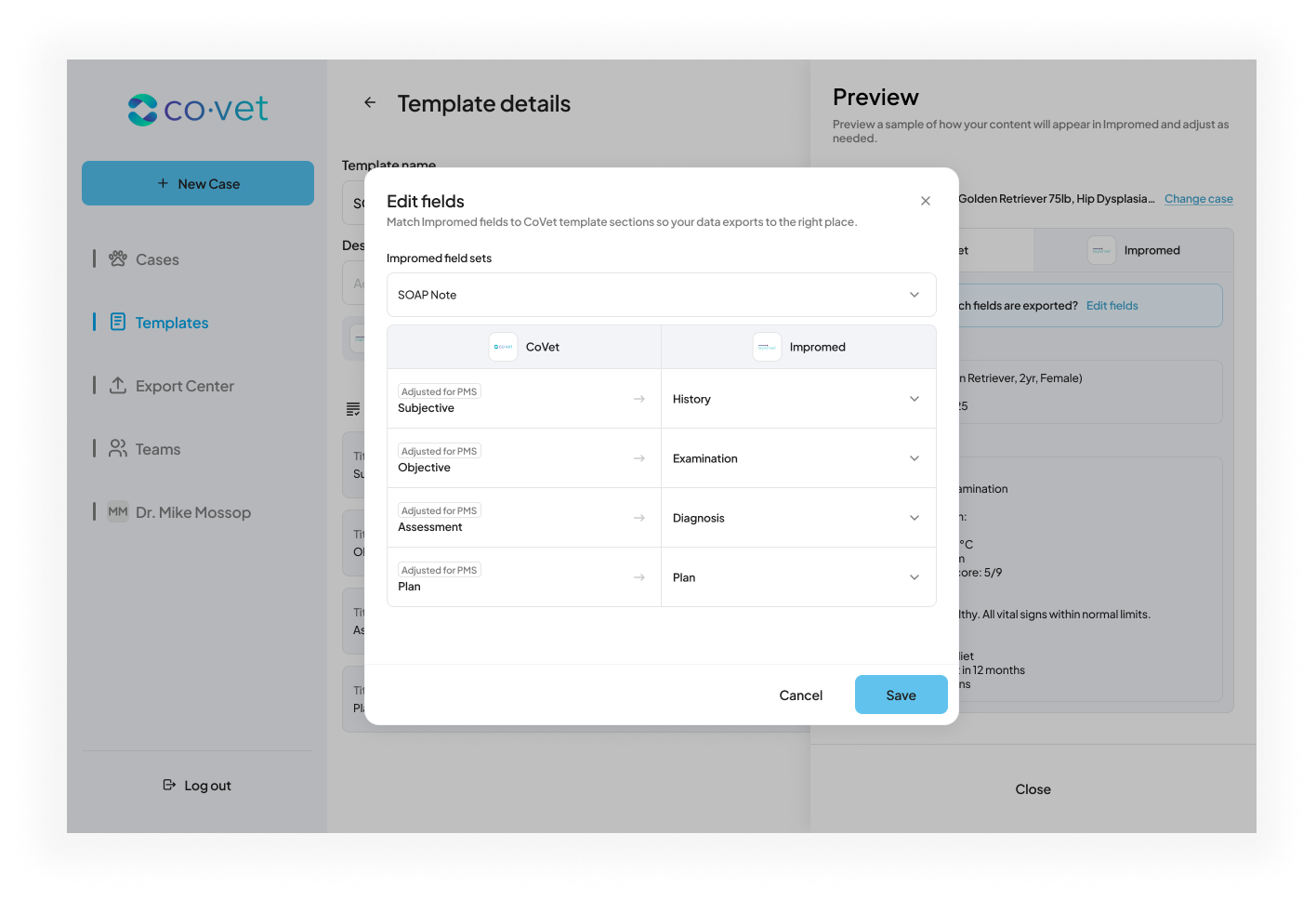 A new window will appear, prompting you to review the mapping for the CoVet sections and how they would appear in Impromed. Here, you can make any changes to the automated mapping suggested by CoVet. If you need to make any changes, click Edit fields.