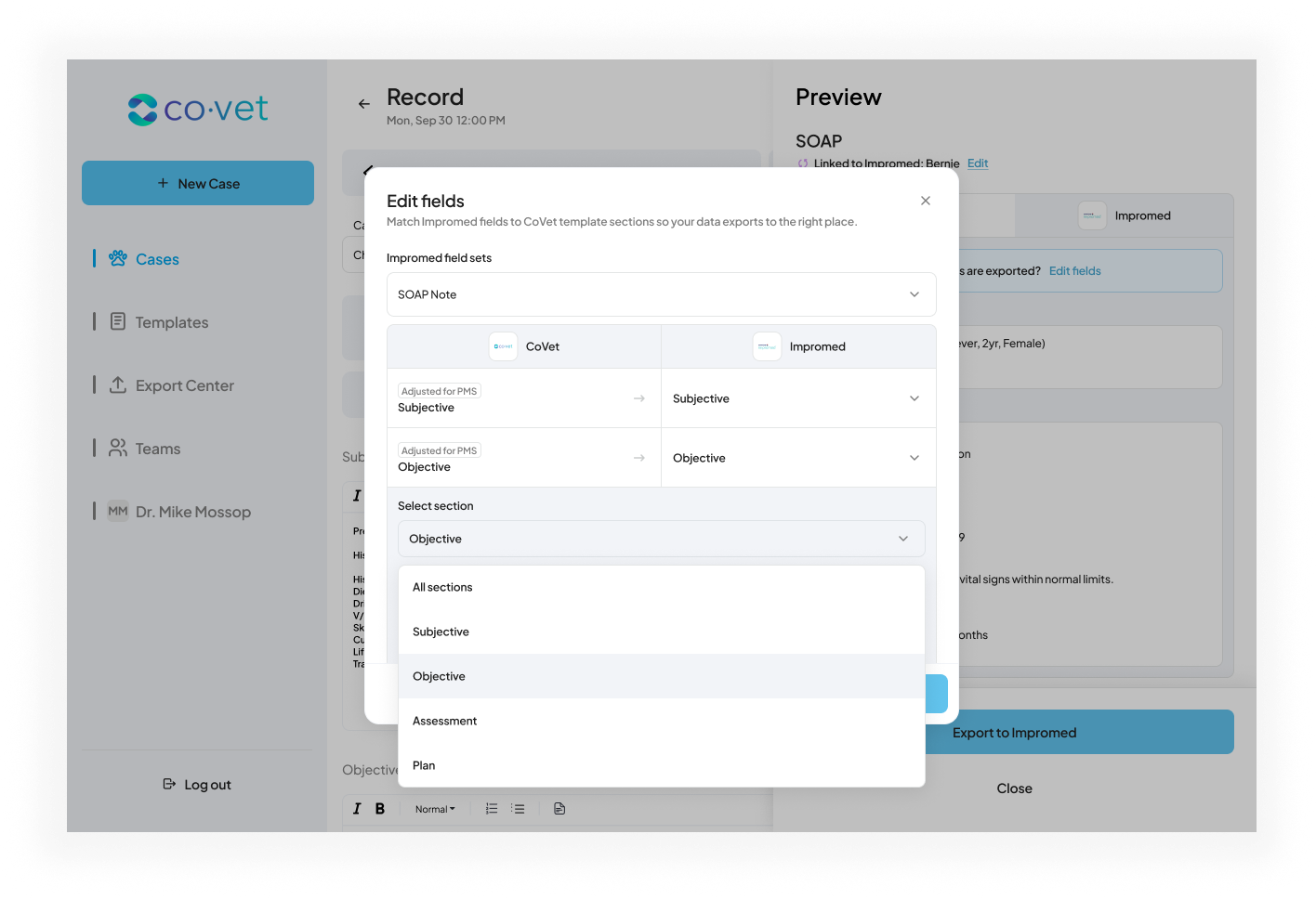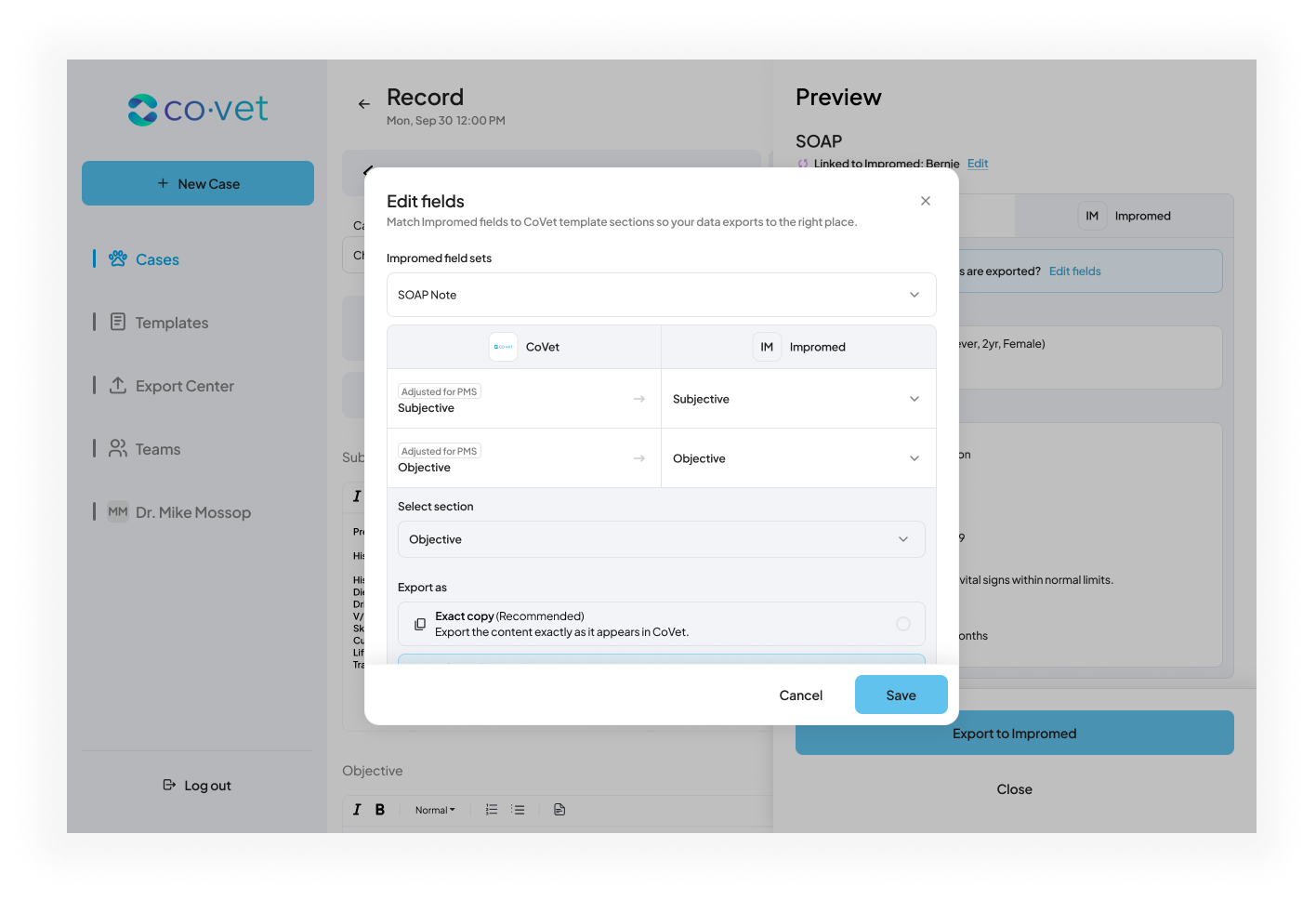 Mapping templates with the Impromed connection ensures that when you use the Export to PMS button in CoVet, all your notes and details are automatically transferred in the correct way.