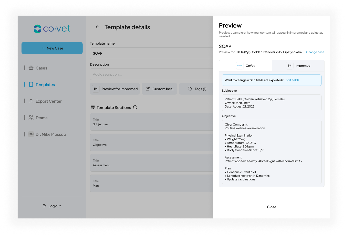 On this screen, you can review how the record will appear in Impromed. If this is not to your liking, you can click Edit fields to make any changes in how your CoVet template is mapped to Impromed