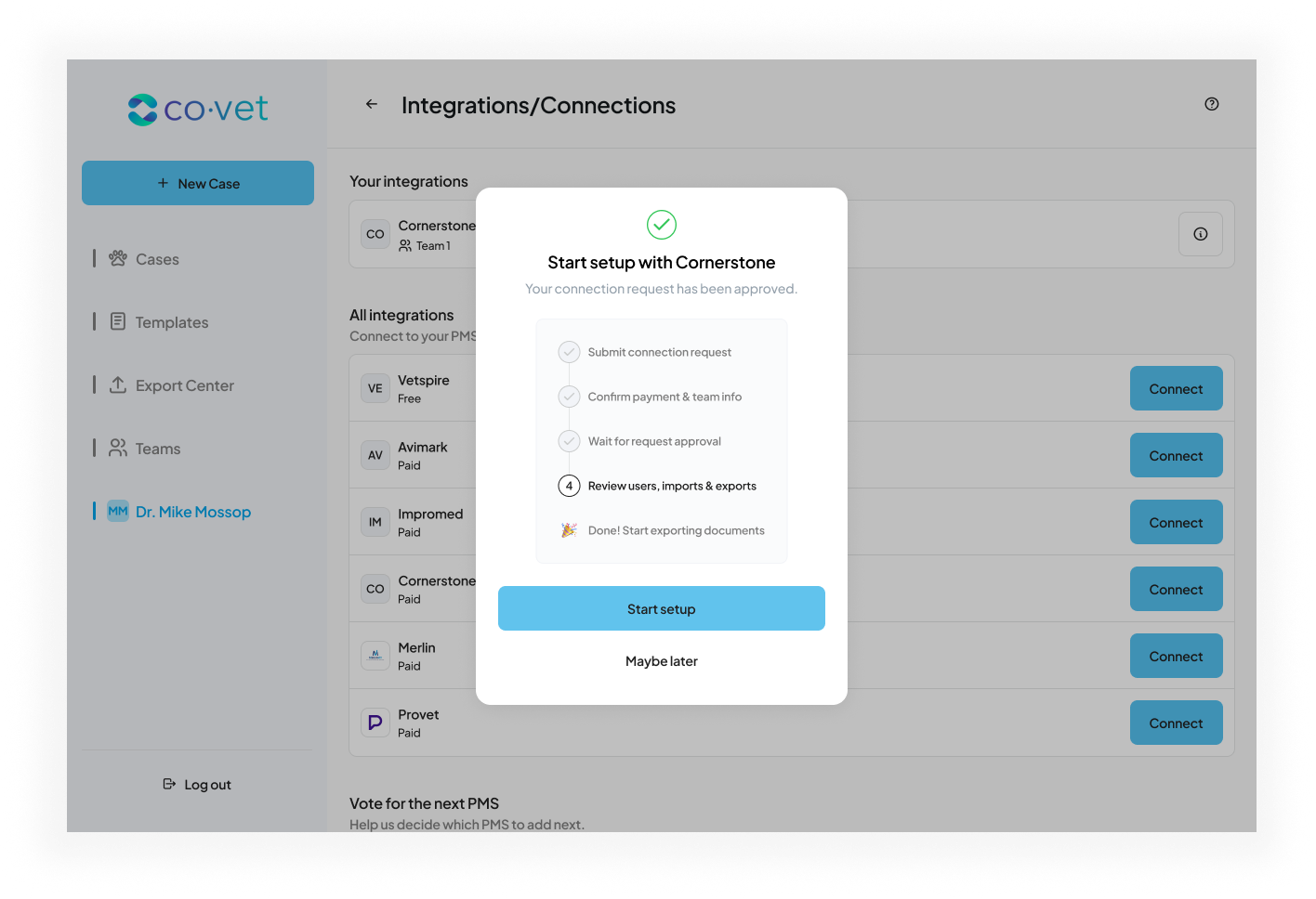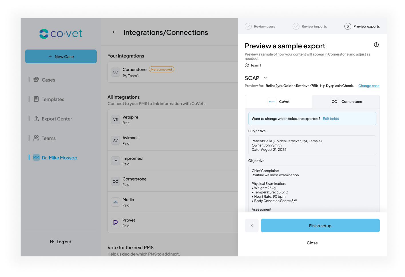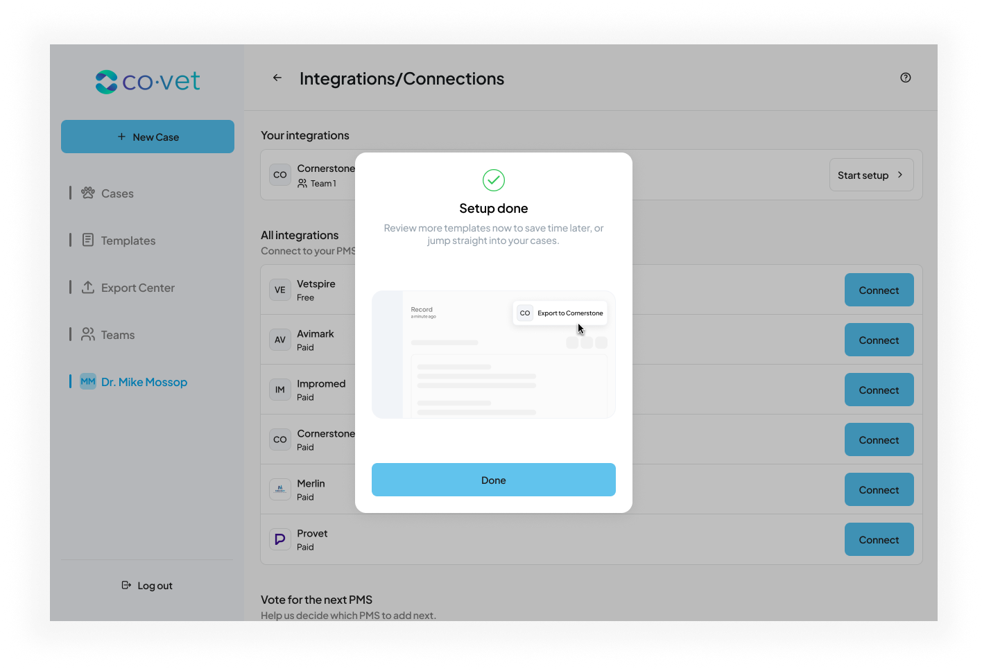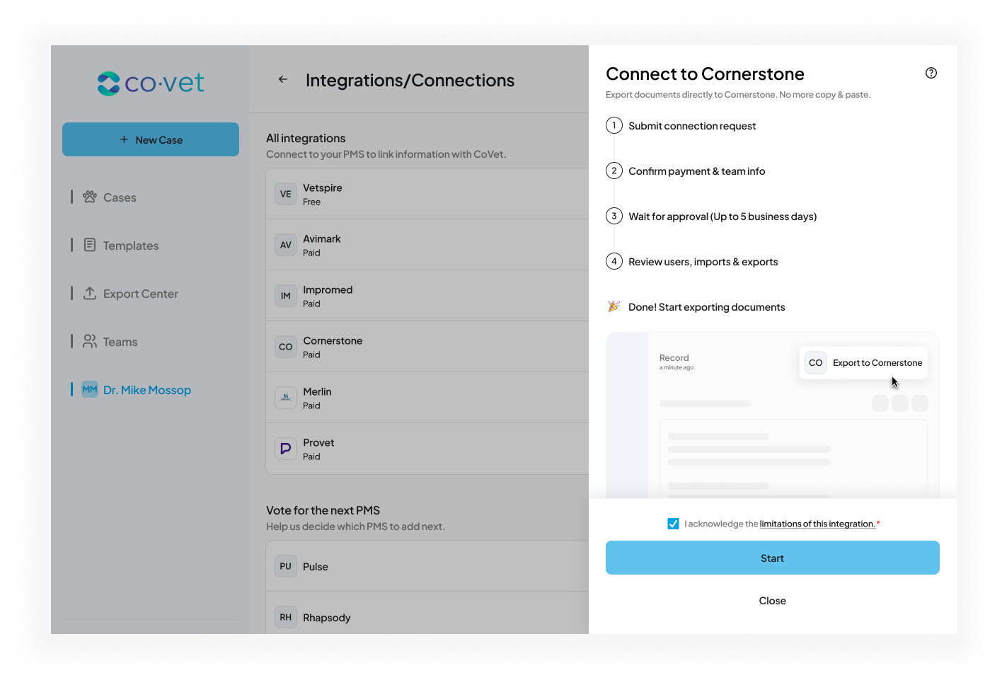 Setting up the Cornerstone connection allows CoVet to automatically sync appointments and medical records between your practice management system and your CoVet workspace.