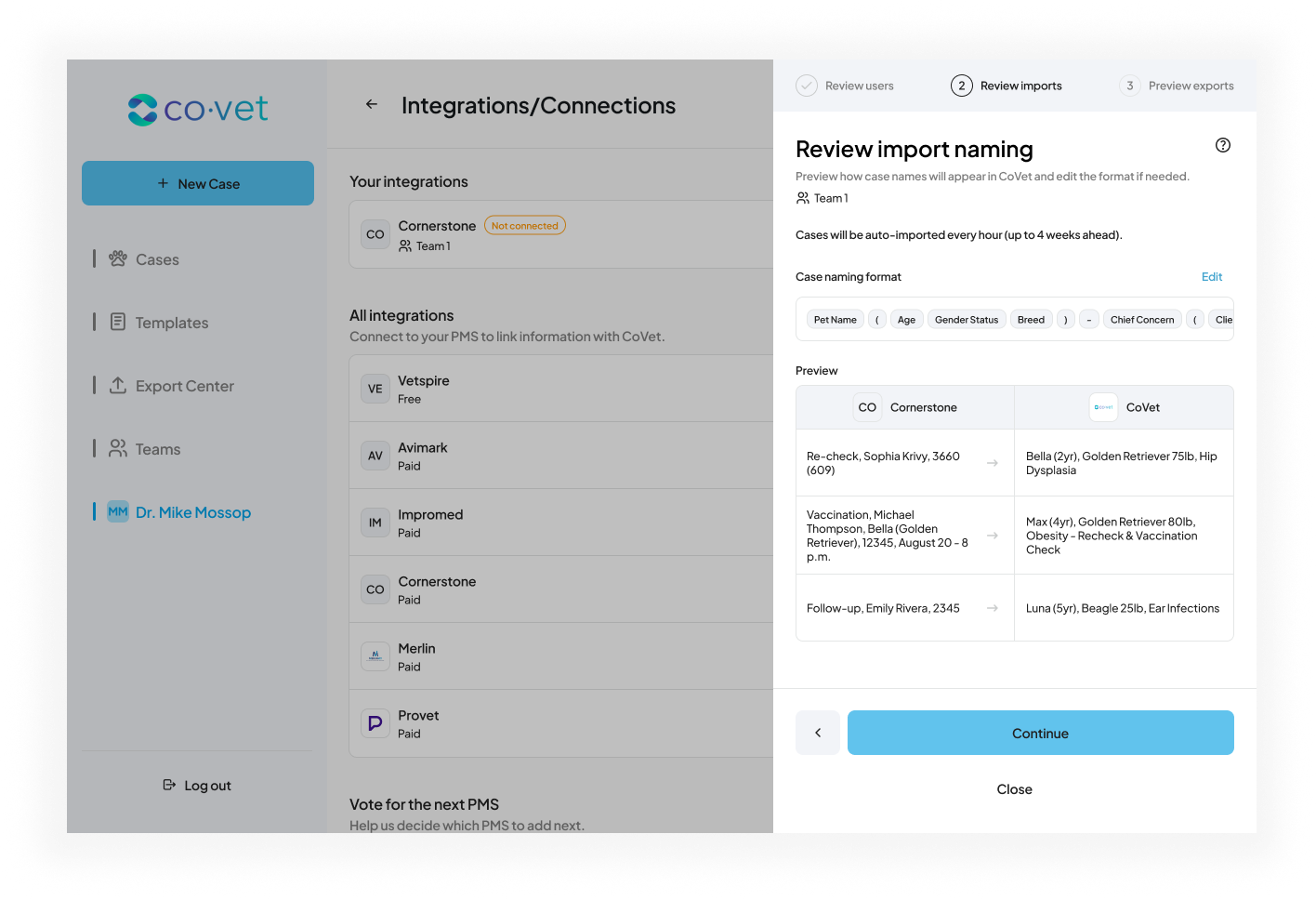 On the next screens, you can review how the names of your appointments from Cornerstone will appear when they are imported into CoVet. The first screen lets you review the case names with a few previews of some connected appointments. You can edit the case naming format here by clicking Edit.