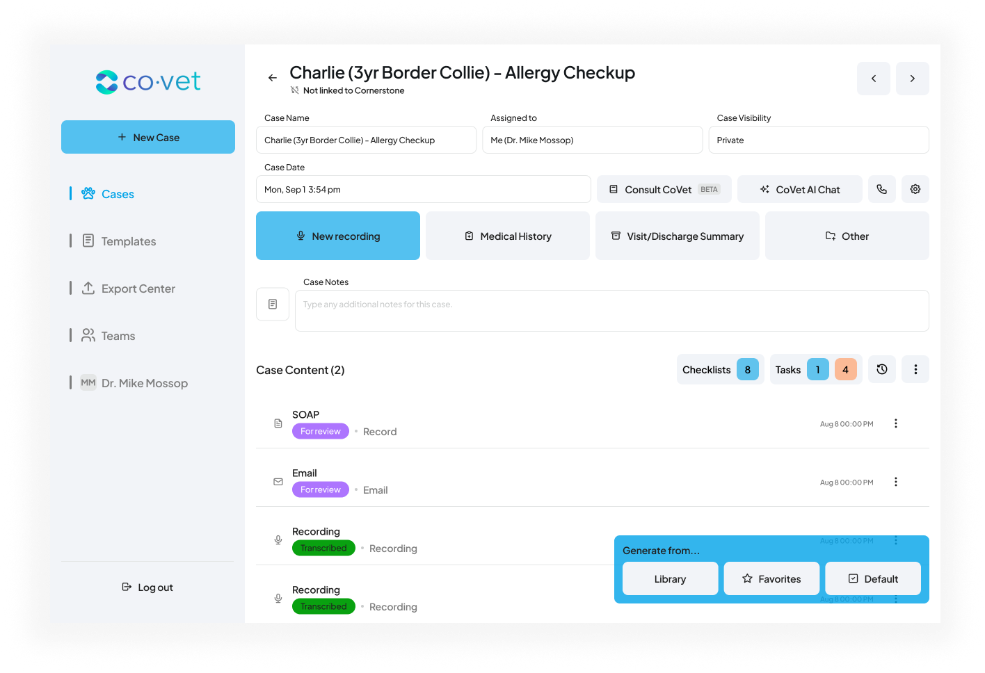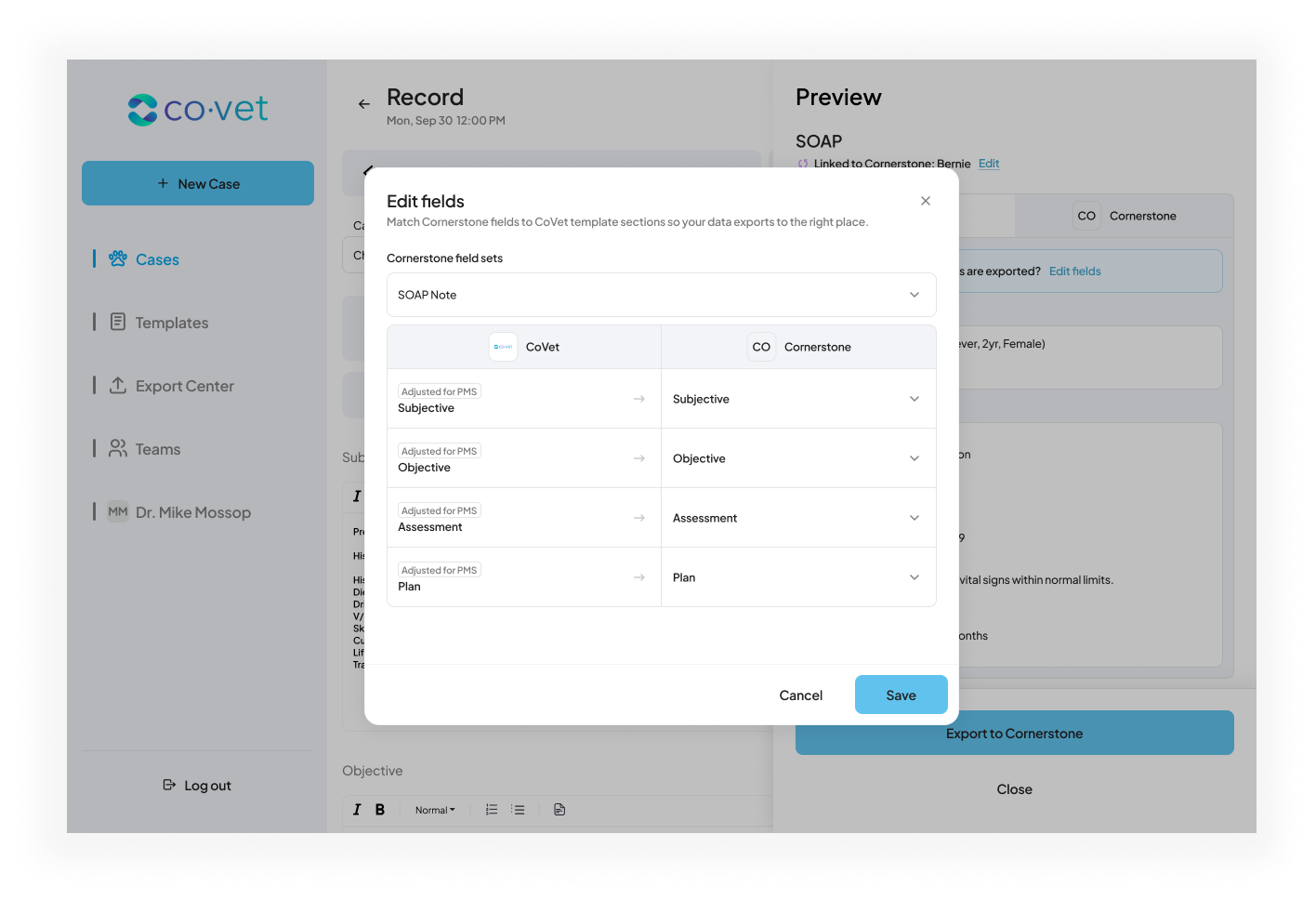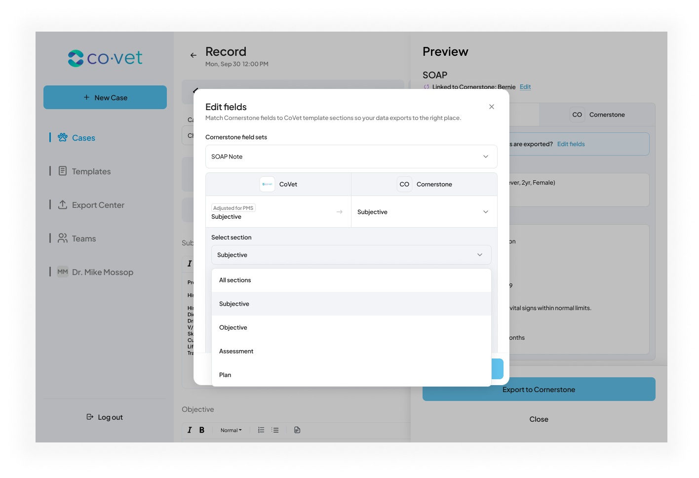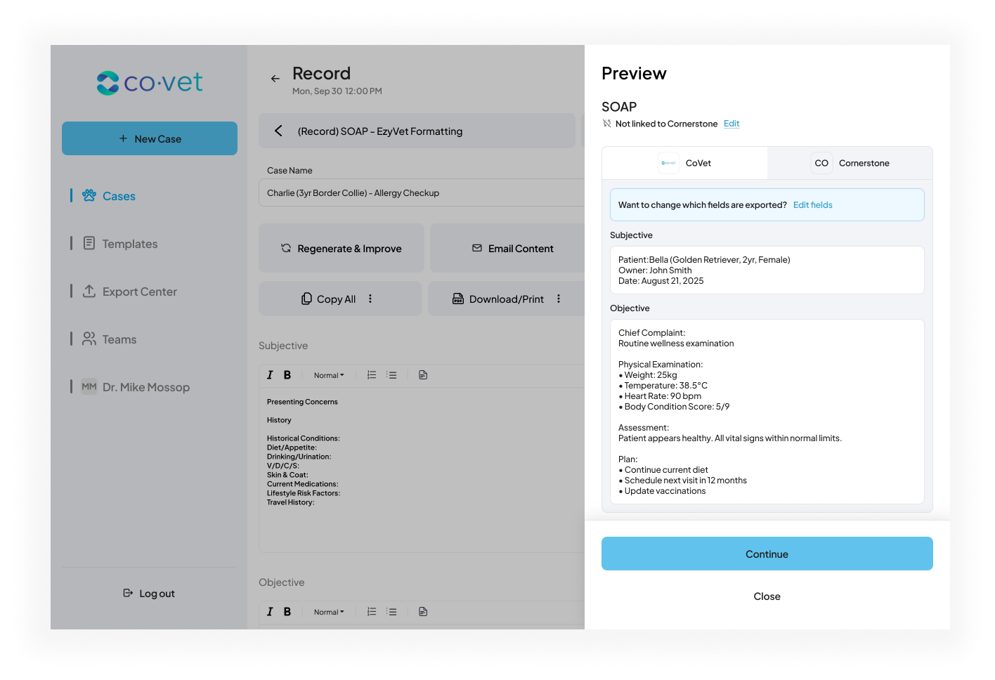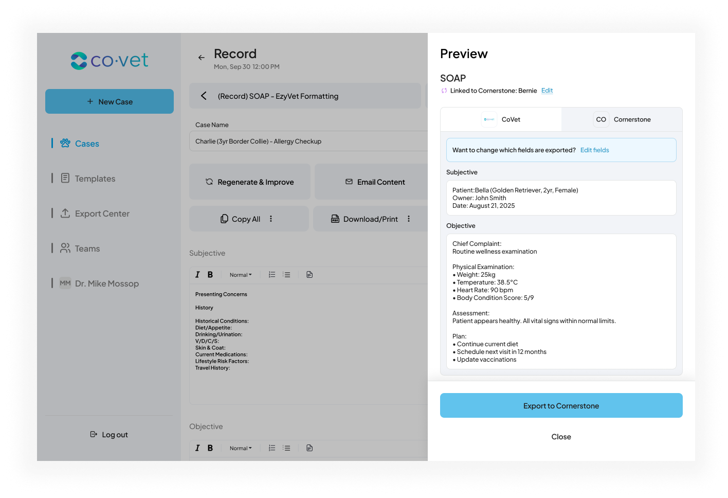 As you create content within those linked CoVet cases, such as documents, notes, and records, the connection allows you to export that content back to Cornerstone. This ensures all case-related materials are automatically saved under the correct patient record in Cornerstone, reducing manual work and keeping patient files complete and up to date.