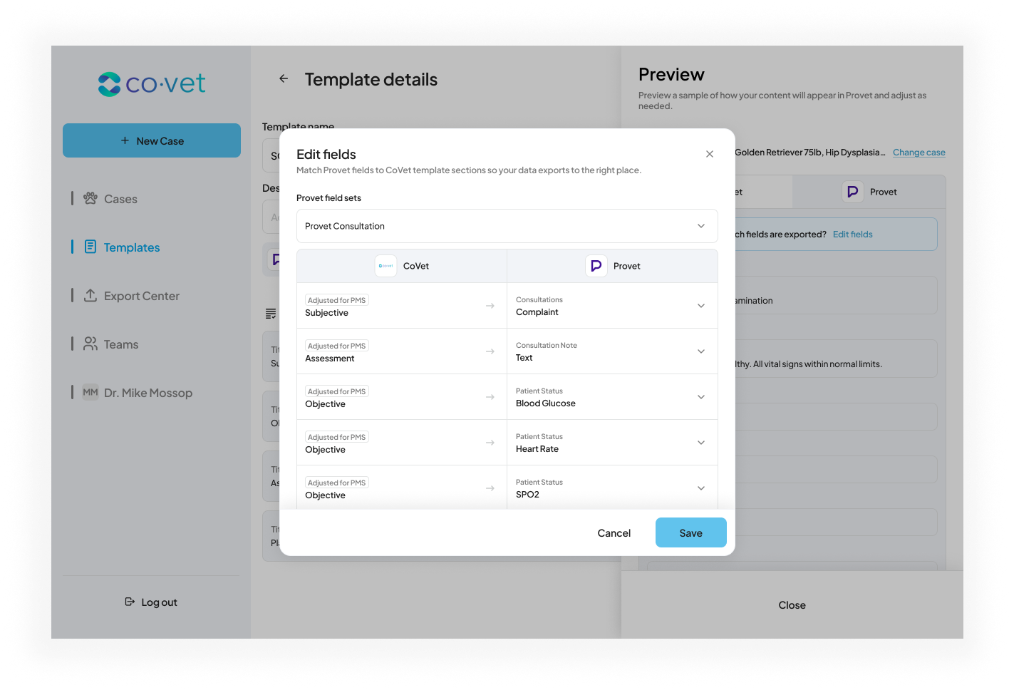 Mapping templates with the Provet integration ensures that when you use the Export to PMS button in CoVet, all your notes and details are automatically transferred in the correct way.