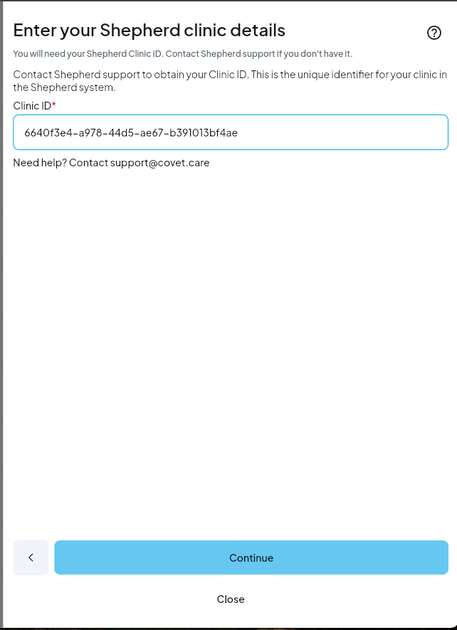 CoVet will validate the Clinic ID by pinging the Shepherd API. If the Clinic ID is invalid, you’ll see an error message with access to support.