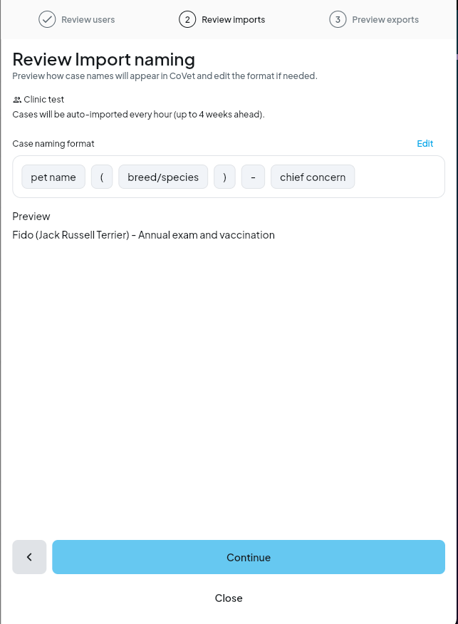 During setup, each CoVet user must be matched to their Shepherd provider. Exact name matches are auto-matched when possible, and at least 1 user must be mapped before import can be completed.
