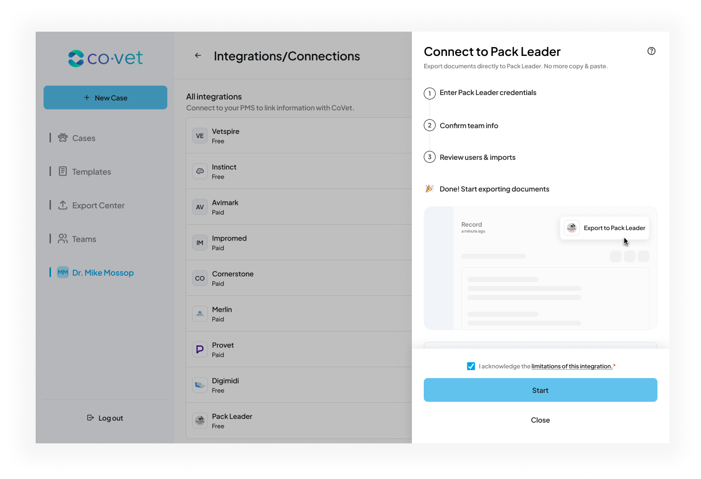 Once the integration is enabled, your team can document visits in CoVet and keep patient records aligned with Pack Leader.