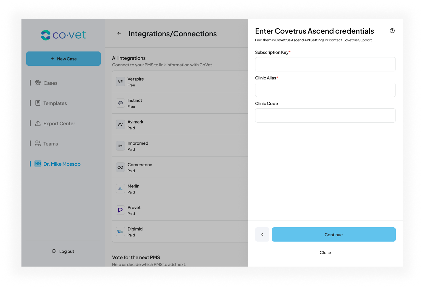 CoVet will ask you for your Covetrus Ascend Subscription Key linked to your clinic.