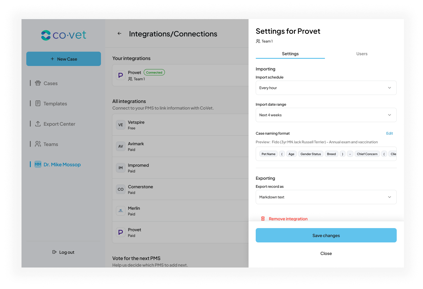 Klik op Wijzigingen opslaan om de instellingen te bevestigen. Uw casussen worden nu automatisch in CoVet geïmporteerd volgens het door u geselecteerde schema.
