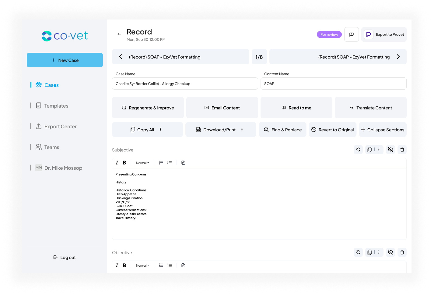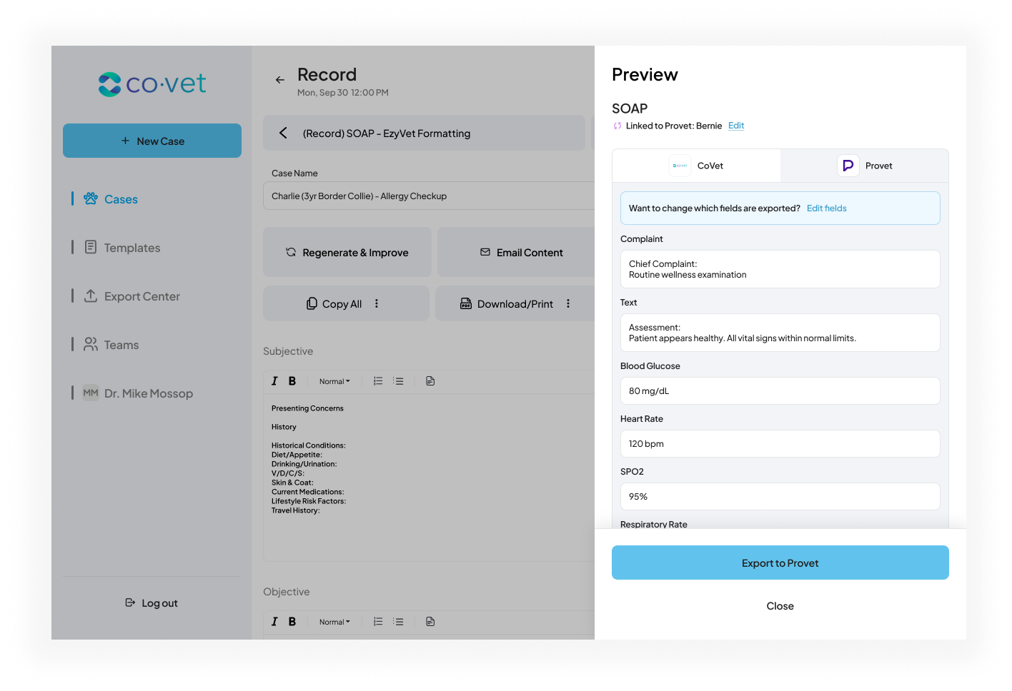 Zodra u tevreden bent met de voorbeeldweergave van de inhoud van het document, klikt u op Exporteren naar Provetom de export te voltooien. Het dossier verschijnt vervolgens in Provet onder de juiste patiën5. Klaar! U kunt verdergaan met uw volgende casus