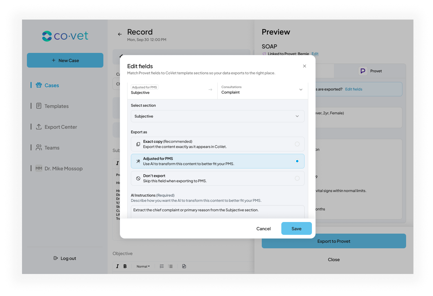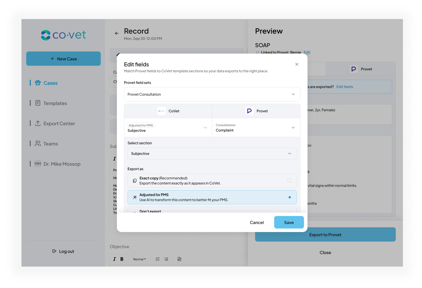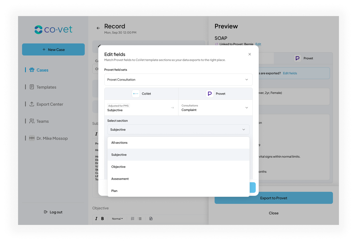 Als u tevreden bent met het document, klik dan op de blauwe knop Exporteren naar Provet of klik op Velden bewerken om wijzigingen aan te brengen.