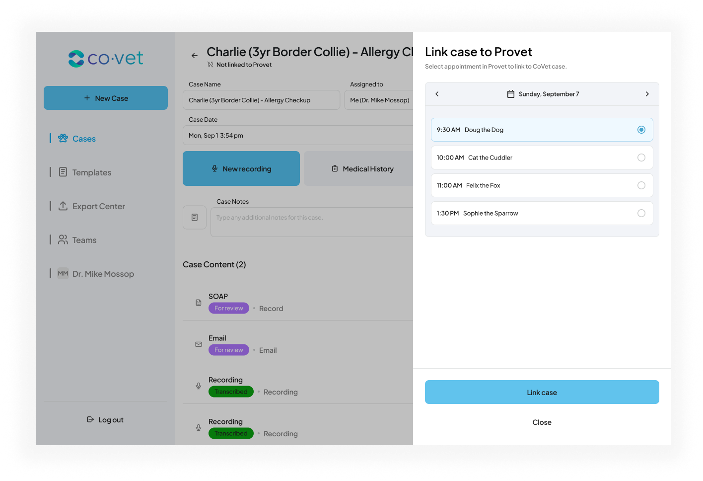 Wanneer u inhoud aanmaakt binnen gekoppelde CoVet-casussen, zoals documenten, notities en andere gegevens, kunt u deze eenvoudig exporteren naar Provet. Dit zorgt ervoor dat alle casus-gerelateerde materialen automatisch onder het juiste patiëntendossier in Provet worden opgeslagen, vermindert handmatig werk en houdt patiëntendossiers volledig en actueel.